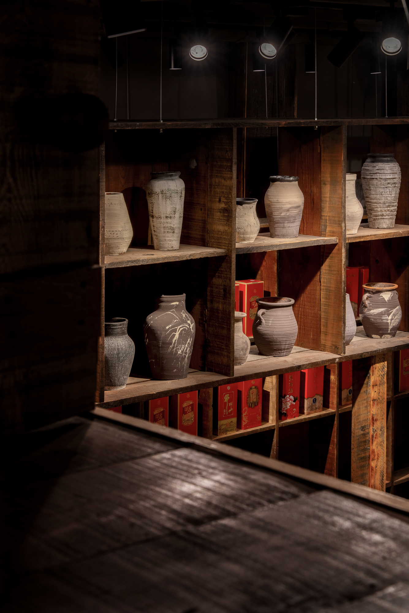 设计运用了具备川渝气息的颜色与材质,传统建筑的灰色底色和老木头,渲染了江湖菜的底色,红色则突出了川菜的火热。我们还选择了竹与鱼篓,成为空间中装饰灯具体系,打造有地域性的色彩。