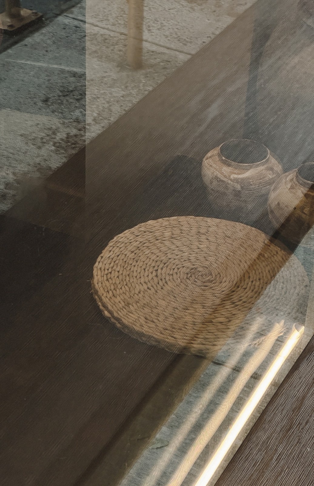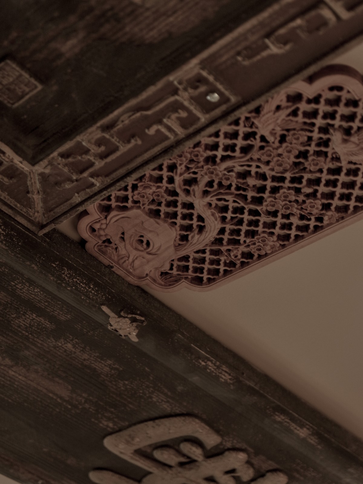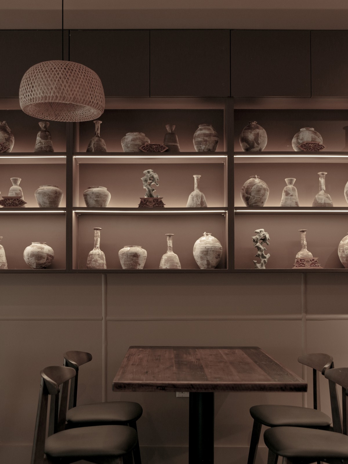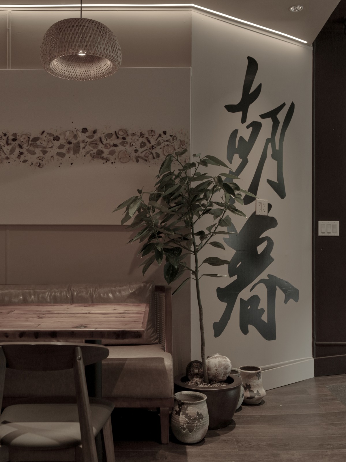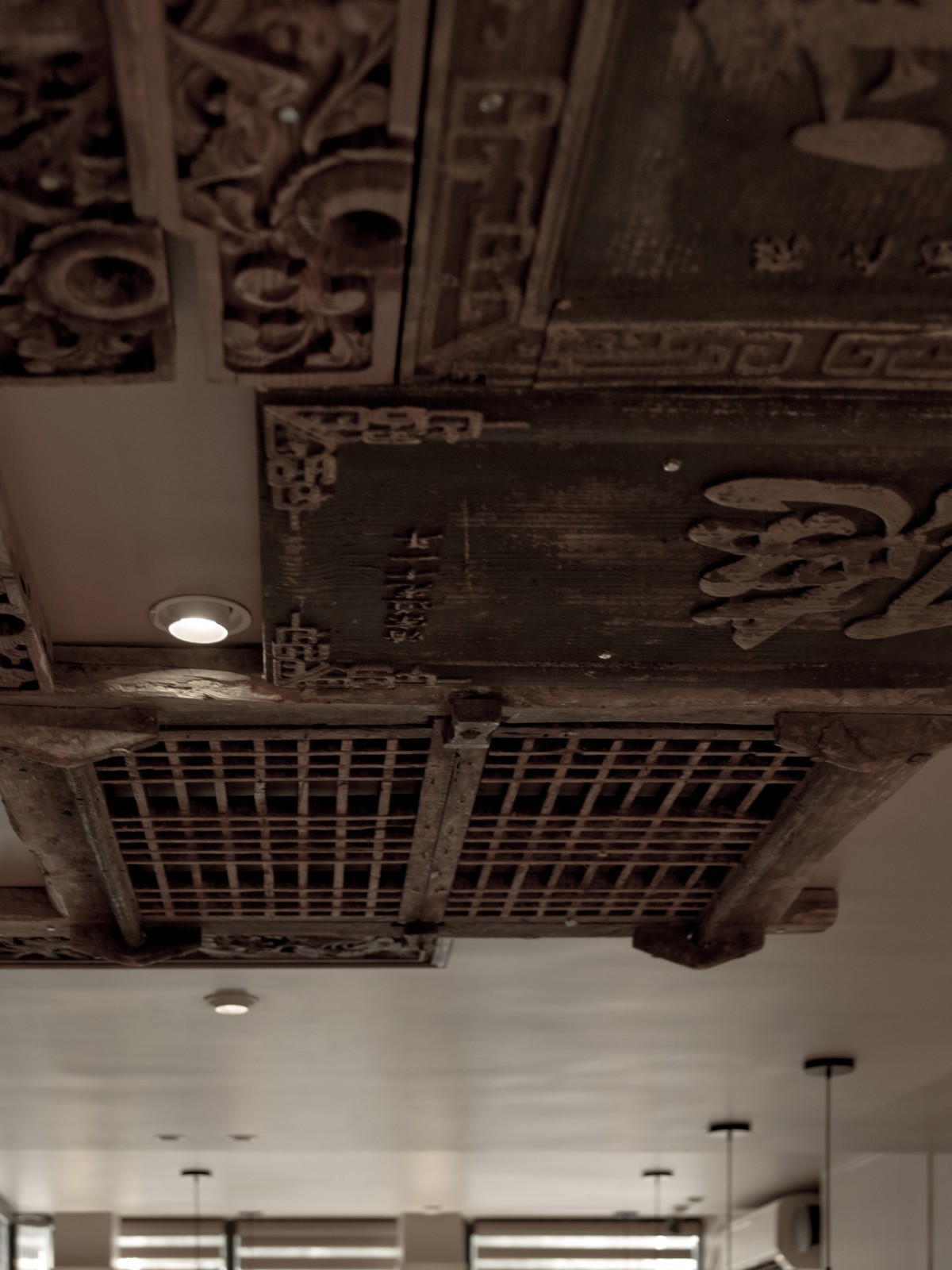 我们希望空间中有中式肌理感,通过木质、布艺、褶皱、陶器纹理等等来丰富肌理,在吧台上方的棚面我们植入了中式牌匾元素,通过复杂的肌理填充顶面的场域,同时将顶面装置化。