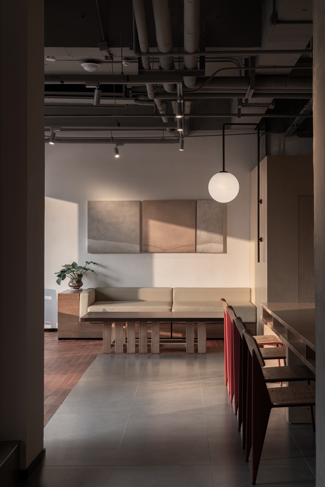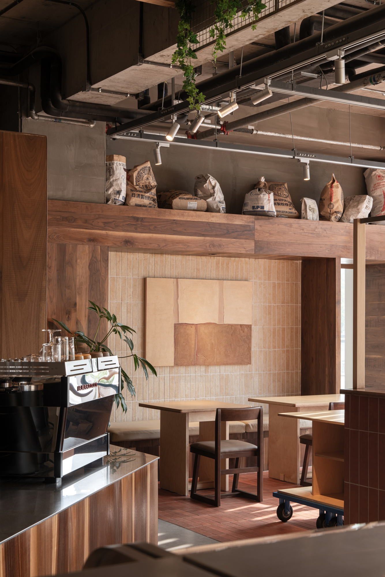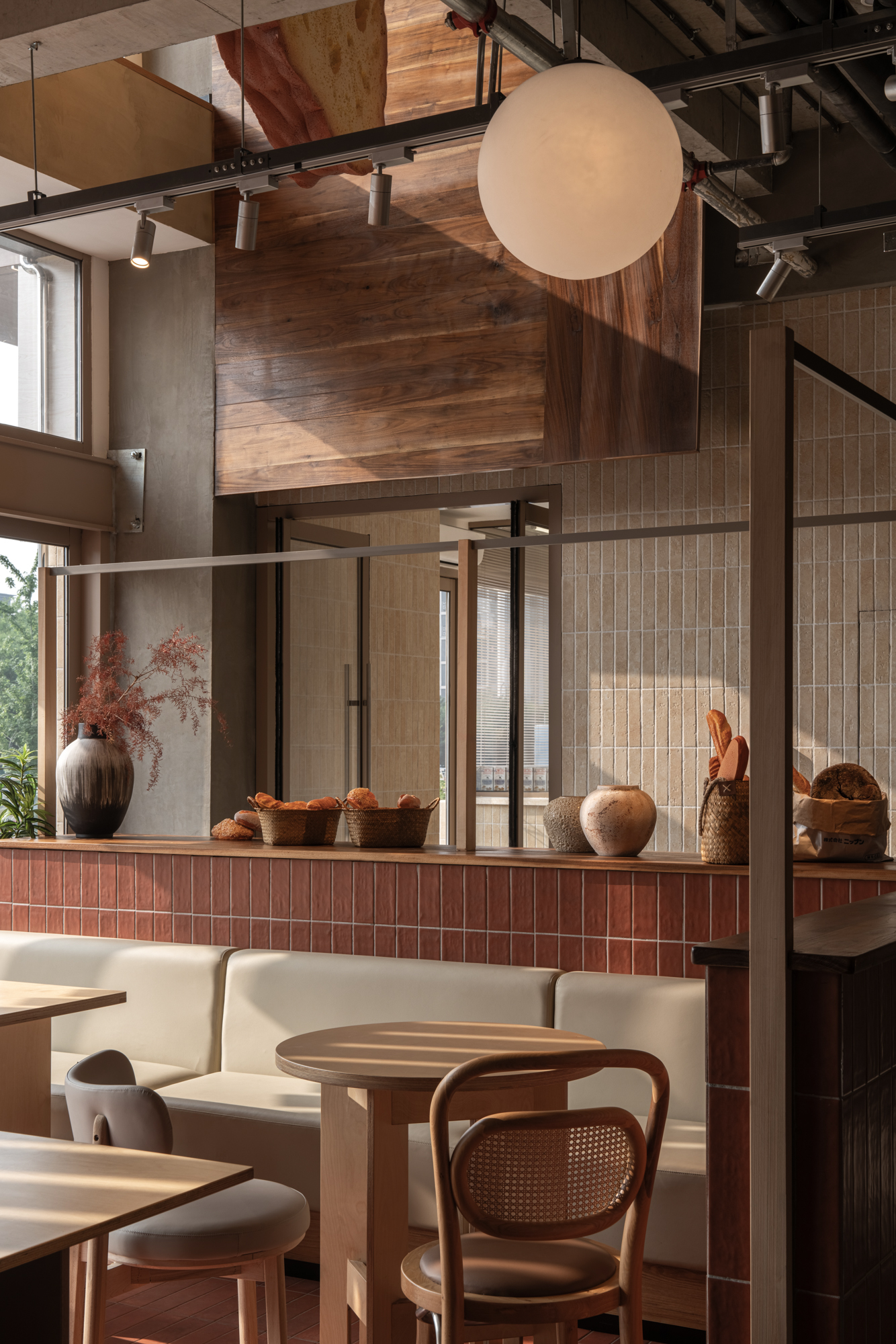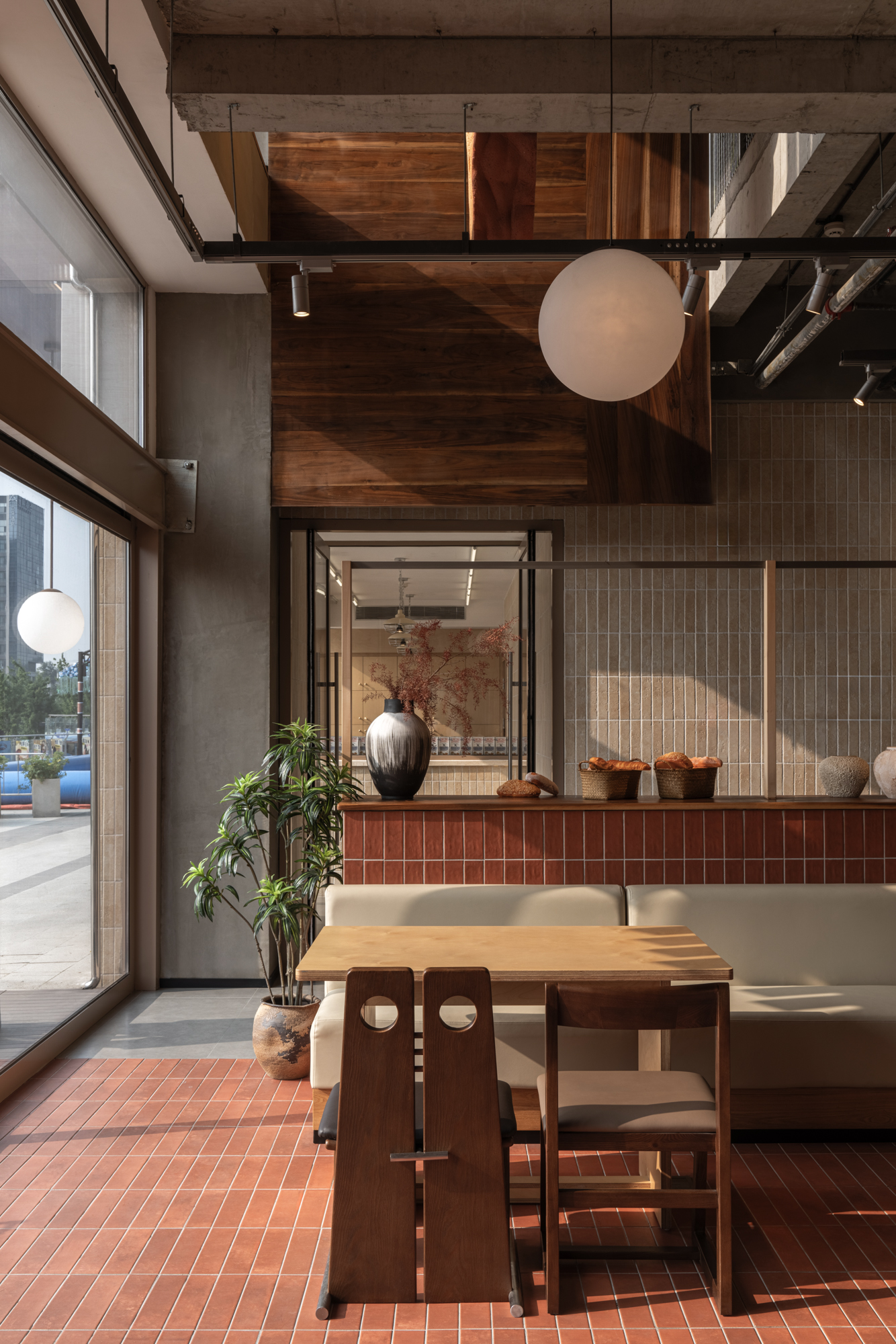 外立面材质选用了一种表面有轻微不平整感的米色砖,结合木色系统与灯光,形成柔和而克制的视觉调性,符合品牌柔中带拙的面包哲学。