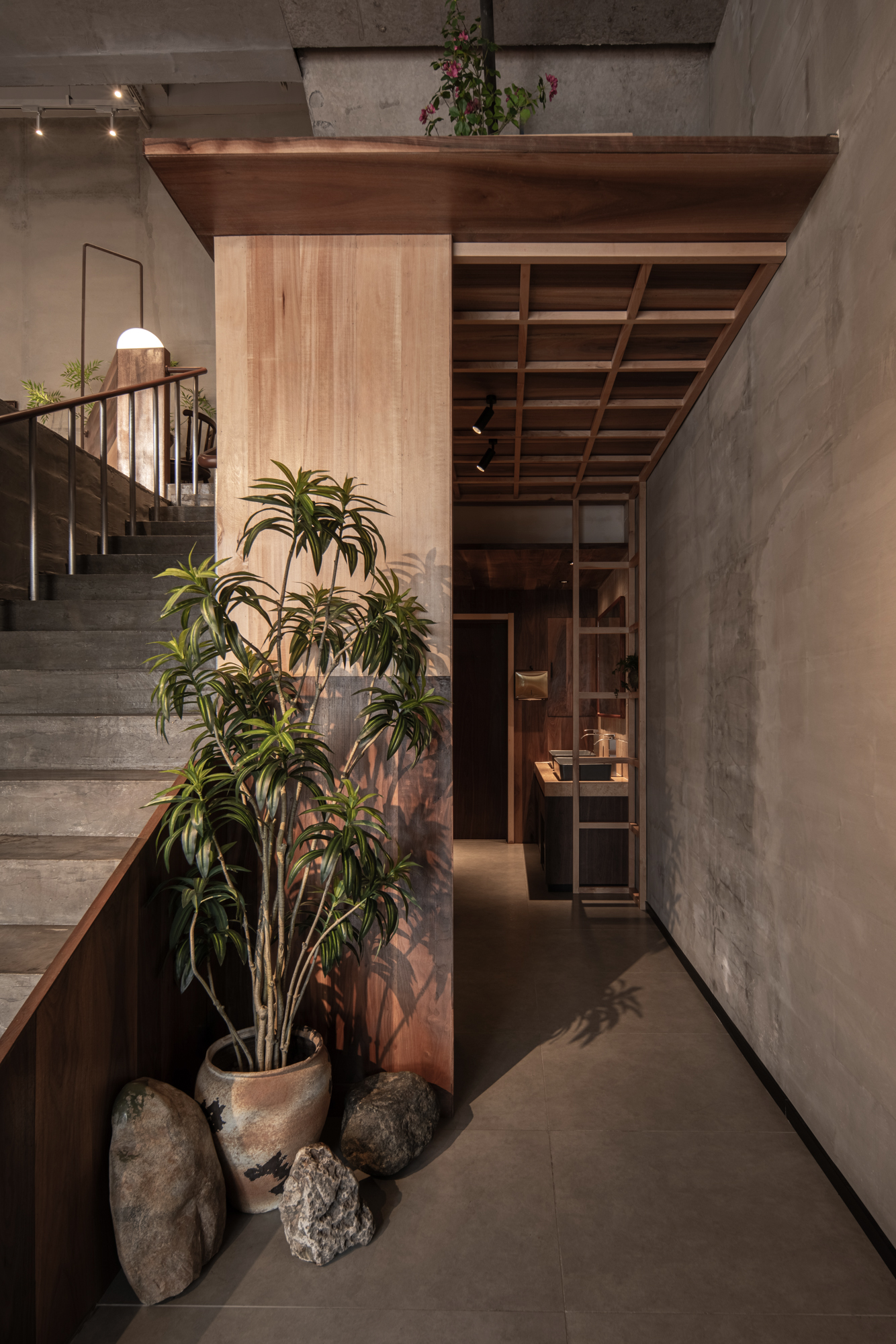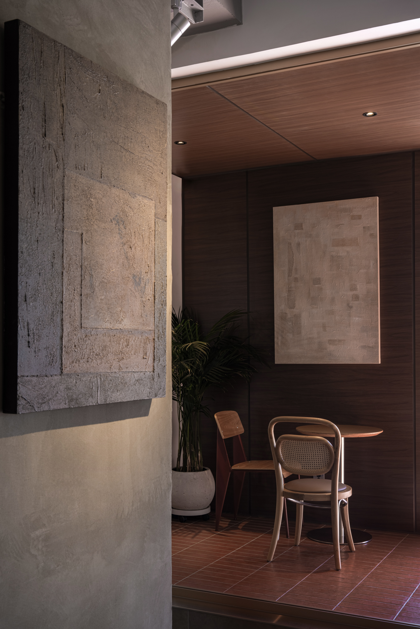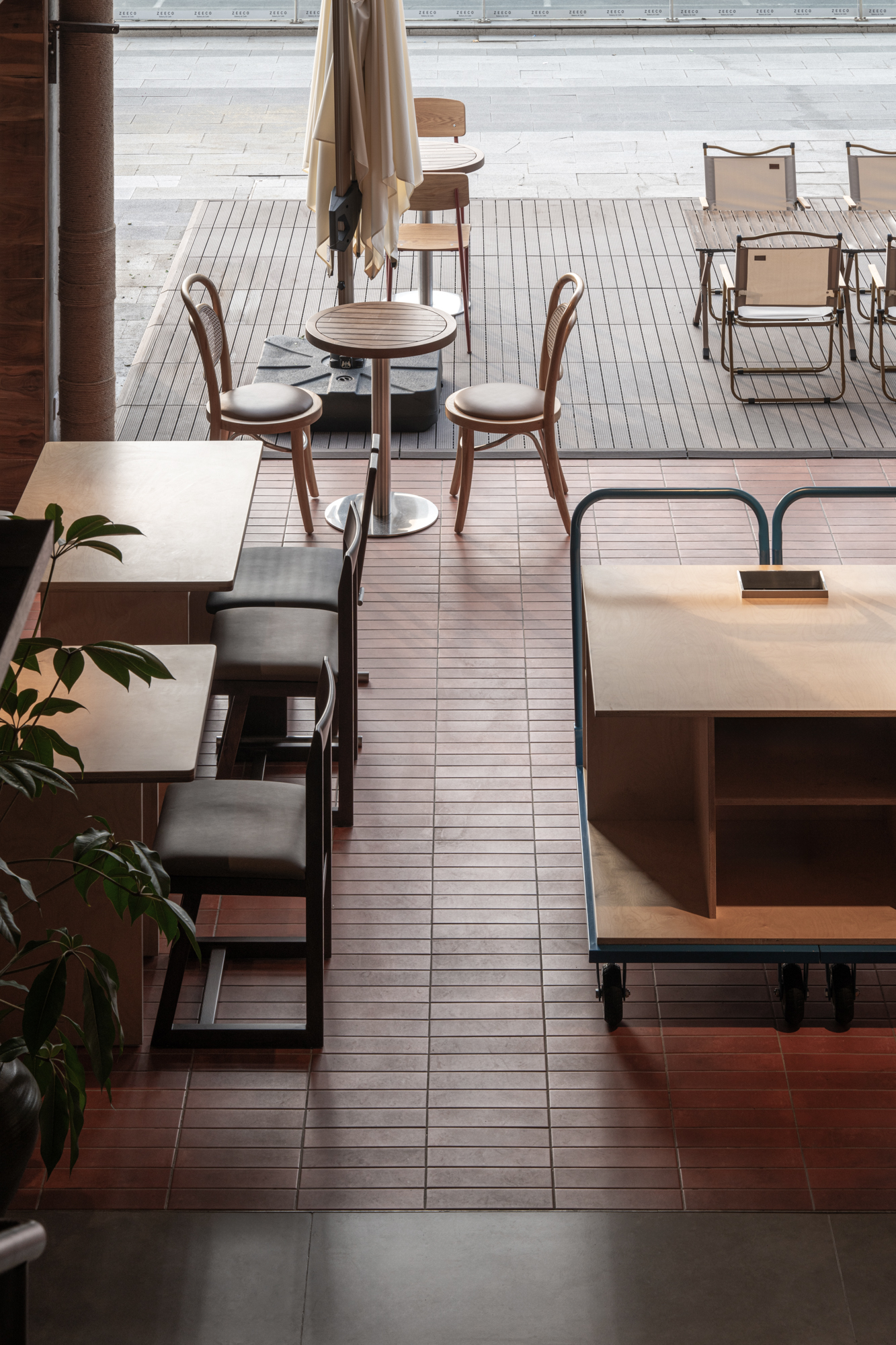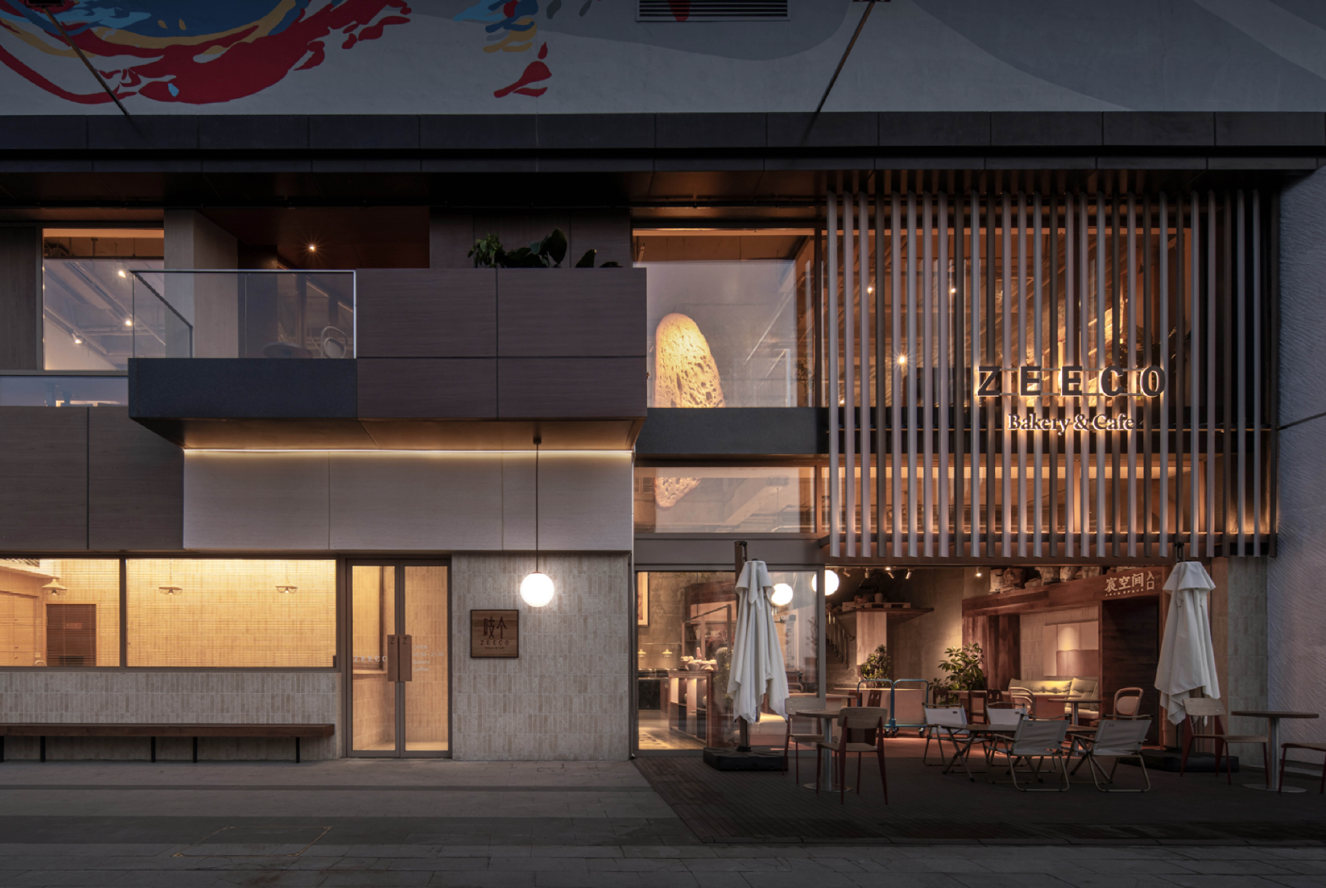 外立面材质选用了一种表面有轻微不平整感的米色砖,结合木色系统与灯光,形成柔和而克制的视觉调性,符合品牌柔中带拙的面包哲学。