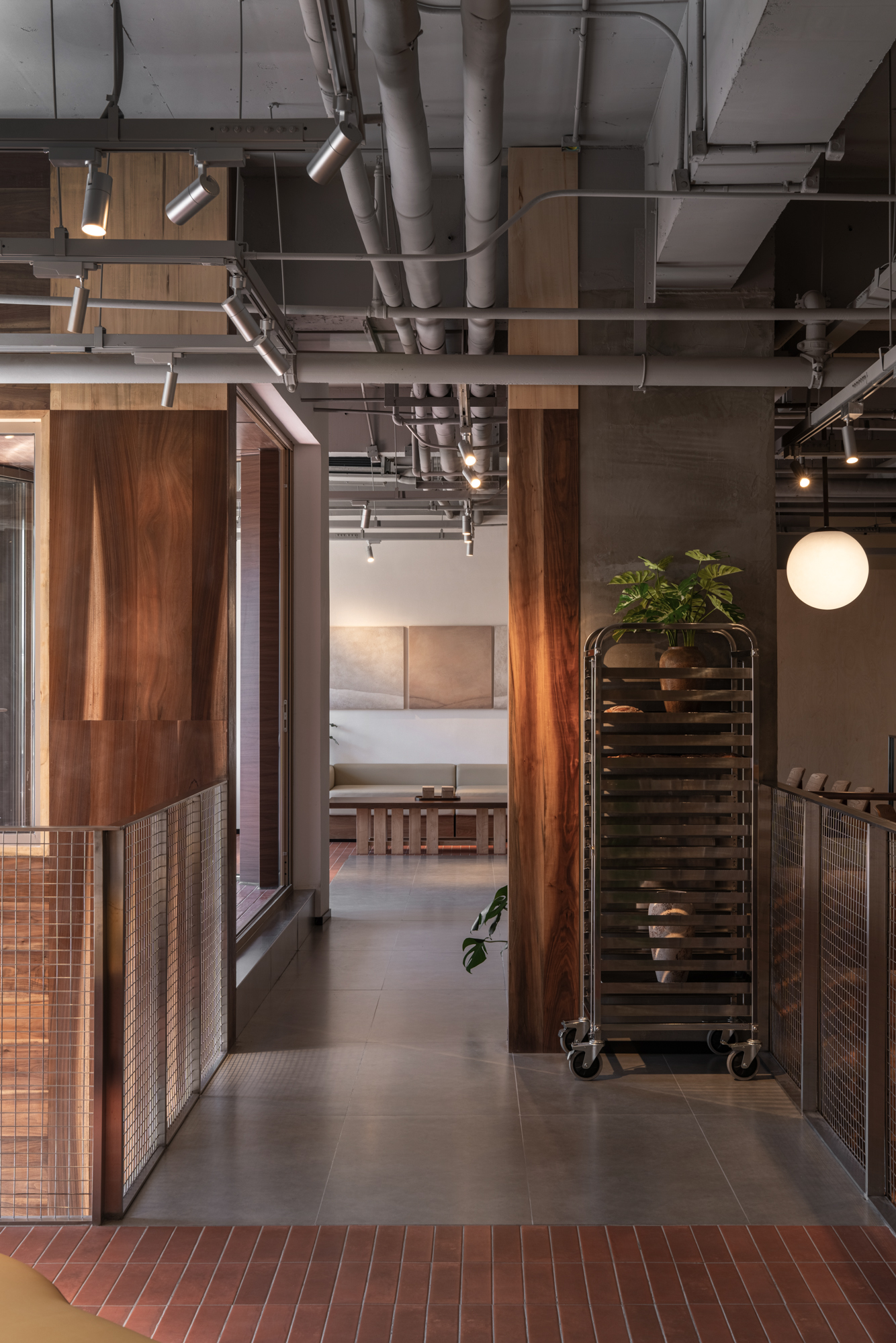 面包不止是商品,它在空间中应该像“被看见的现场感”。站在门口,可以看到面包摆放、陈列、制作的全过程;也可以望见楼上的座位、灯光与人的活动,让这座店成为一个开放而透明的“酵母剧场”。