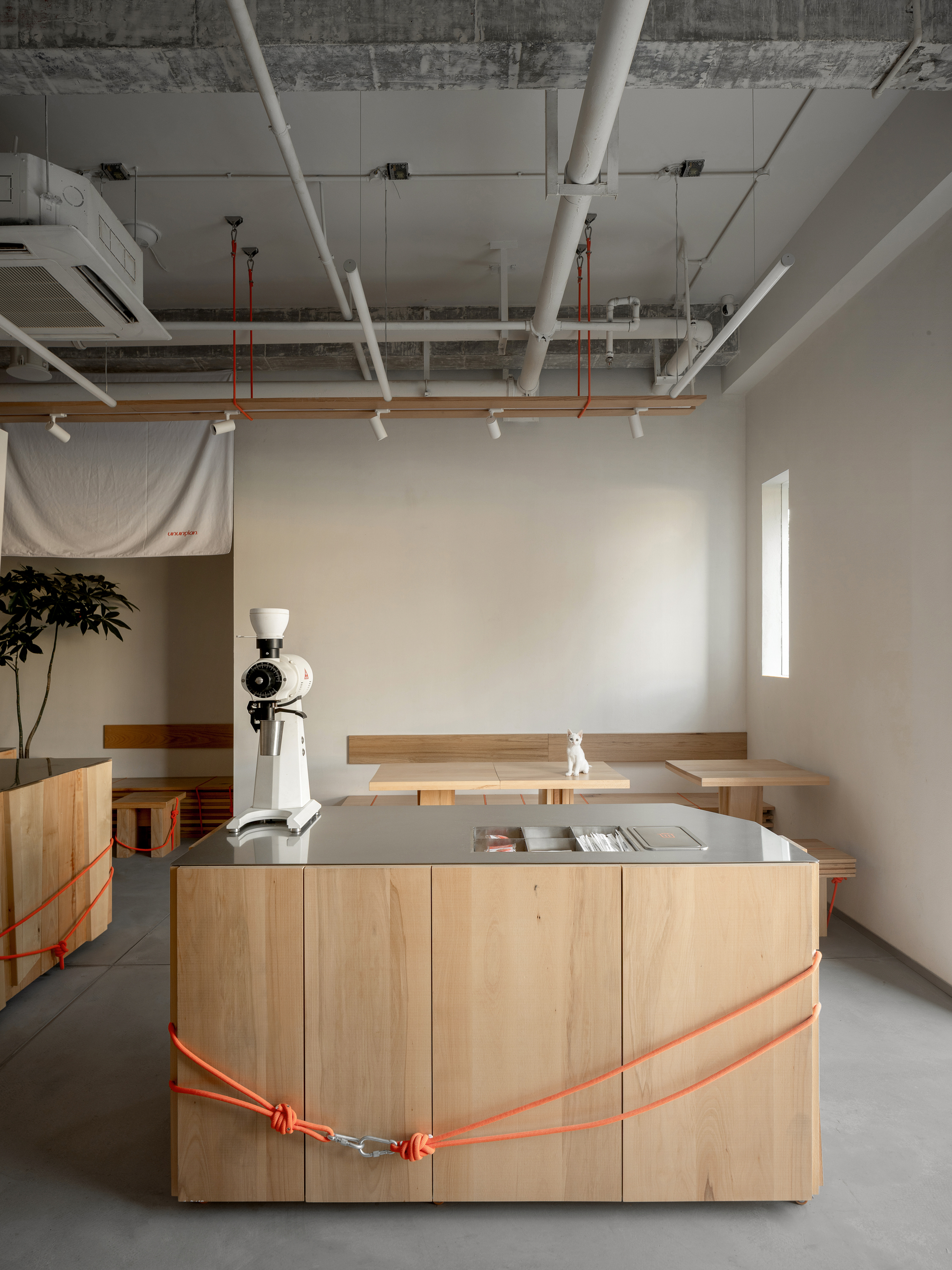 UNUNPLAN 的品牌色是橙色。我们选择在极少数、极精致的局部中,让橙色成为一条隐秘的线索。它出现于家具转角、绳索节点、结构接口处,与空间中选用的橙调木材相互呼应,让空间保持克制同时,又保有一种蓄势待发的精神感。