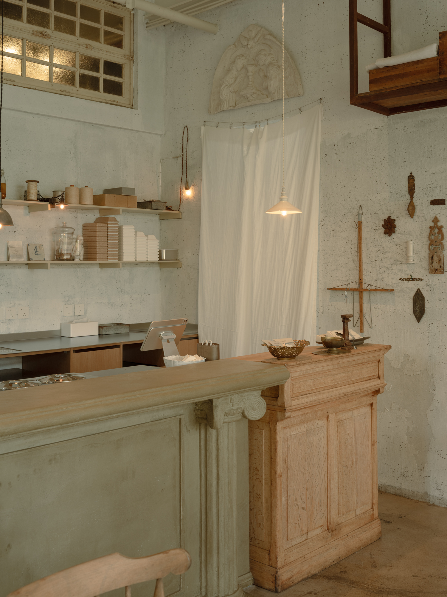 空间聚焦到产品的品质,不只是对甜品的精细打磨,更在于整体氛围中传递出的手作气息。从设计伊始,我们便希望以一种沉着克制的语气,让时间沉淀的质感发声。