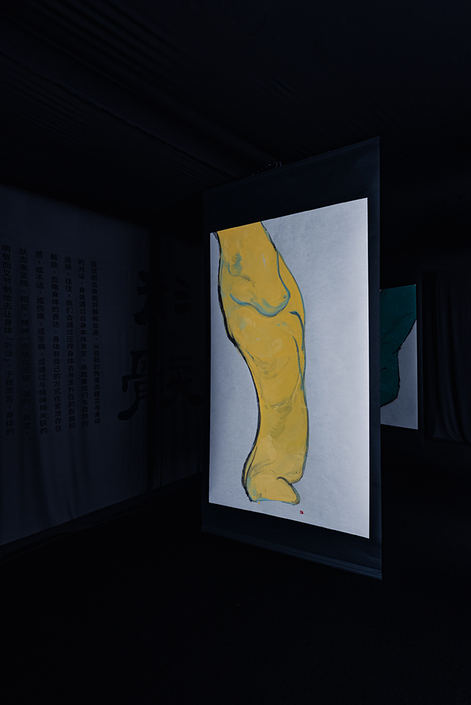 "The space is created around distance, movement, and unmeasurability, and the eight exhibits are removed from the wall and hung in the air, allowing the viewer to walk freely through the paintings. The viewer walks freely through the paintings, wandering, spinning, and dodging, creating a subconscious sense of distance. The viewer dialogues with himself through a state of being embodied by the space and the artworks."