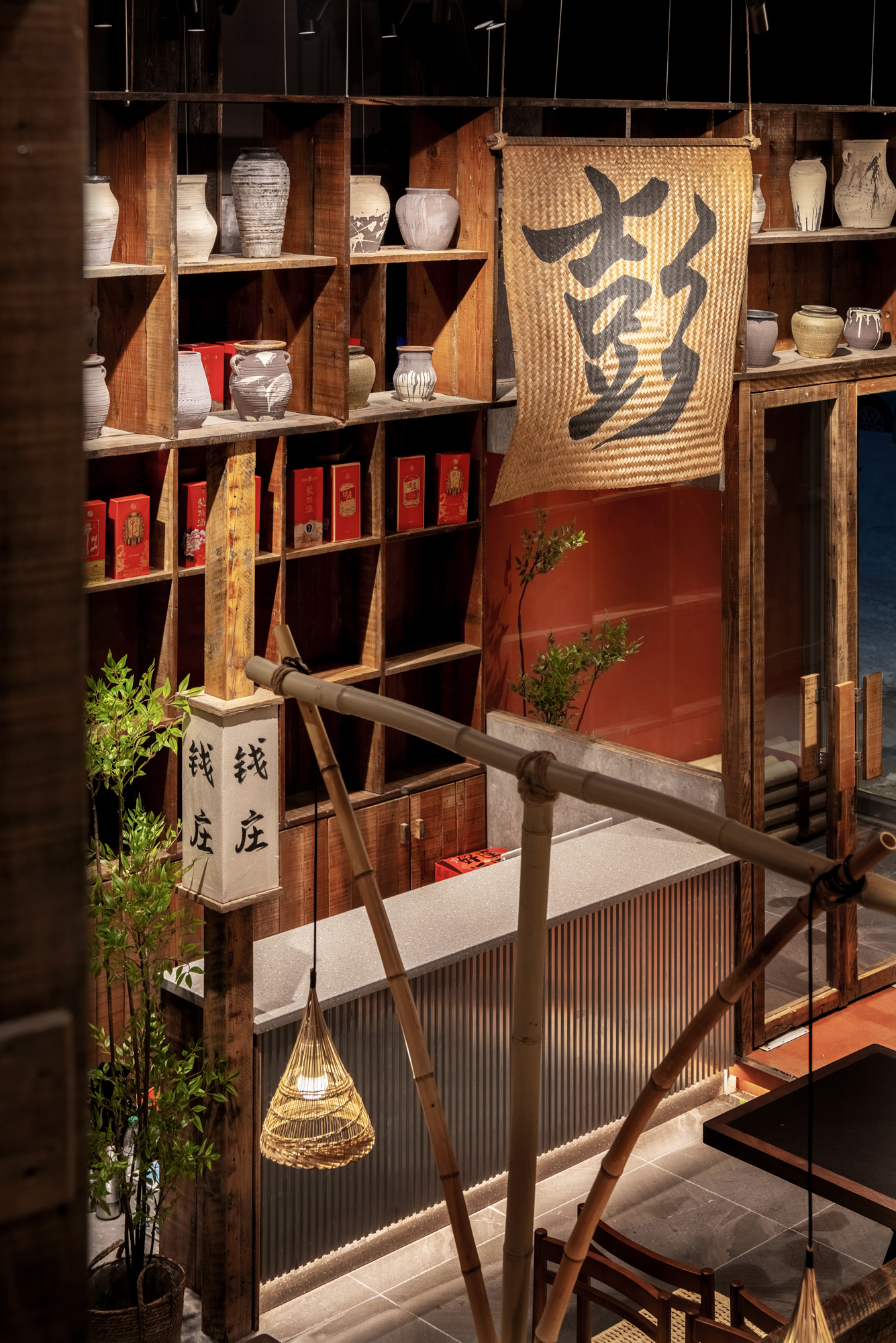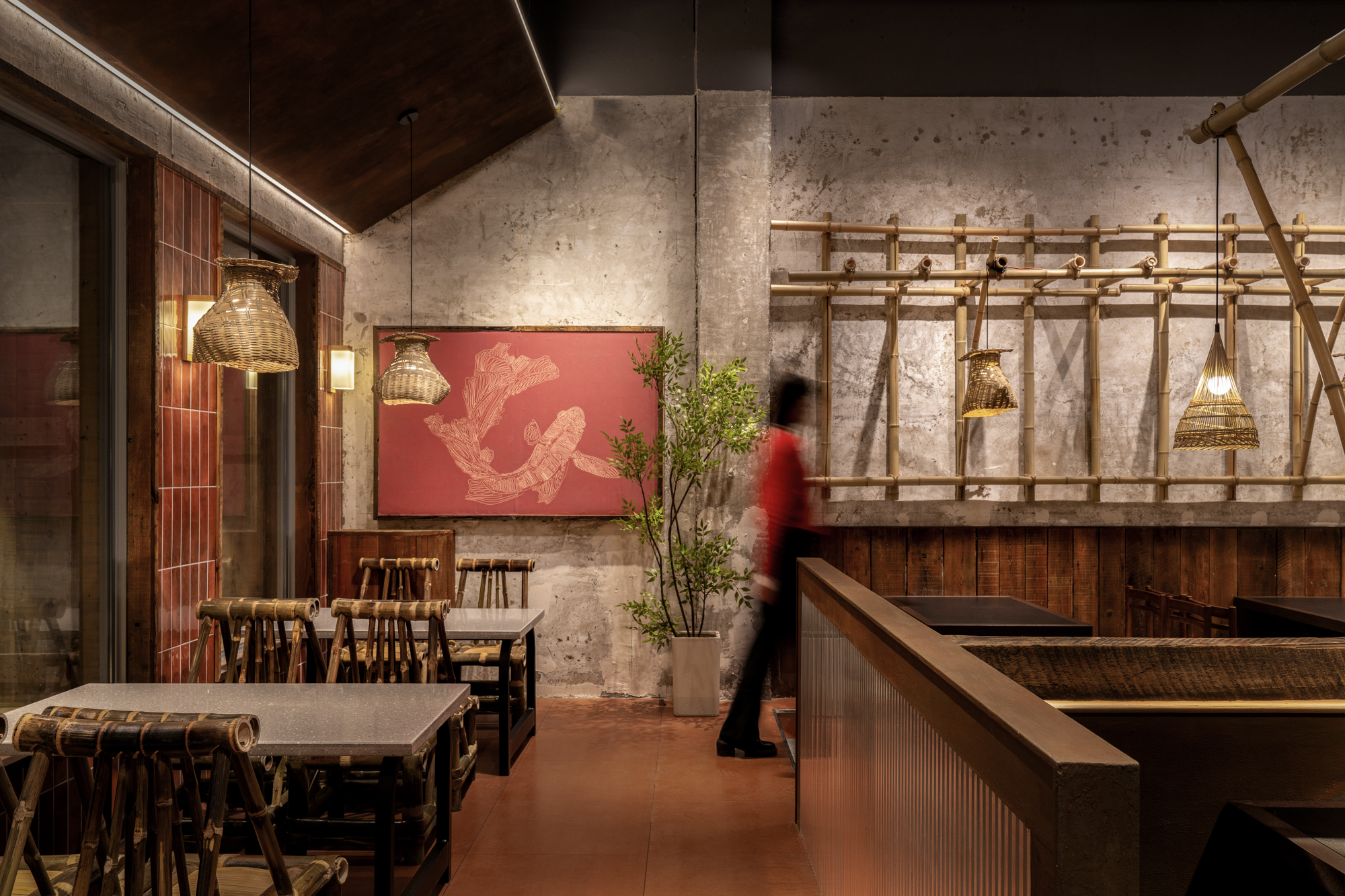 The design incorporates colors and materials evocative of Sichuan and Chongqing, with traditional gray tones and reclaimed wood setting the foundation for Jianghu cuisine, while red highlights the fiery essence of Sichuan flavors. Bamboo and fish baskets are also used as decorative lighting elements, adding a distinct regional character to the space.