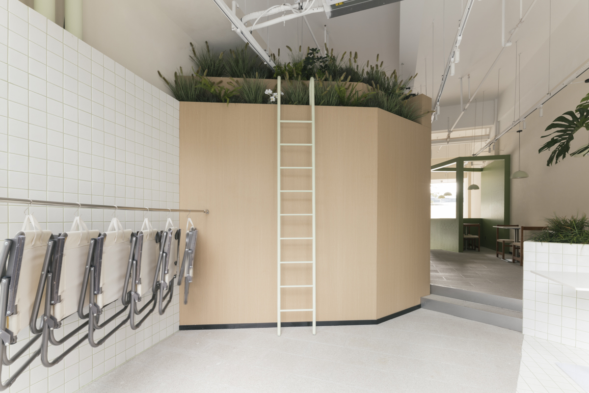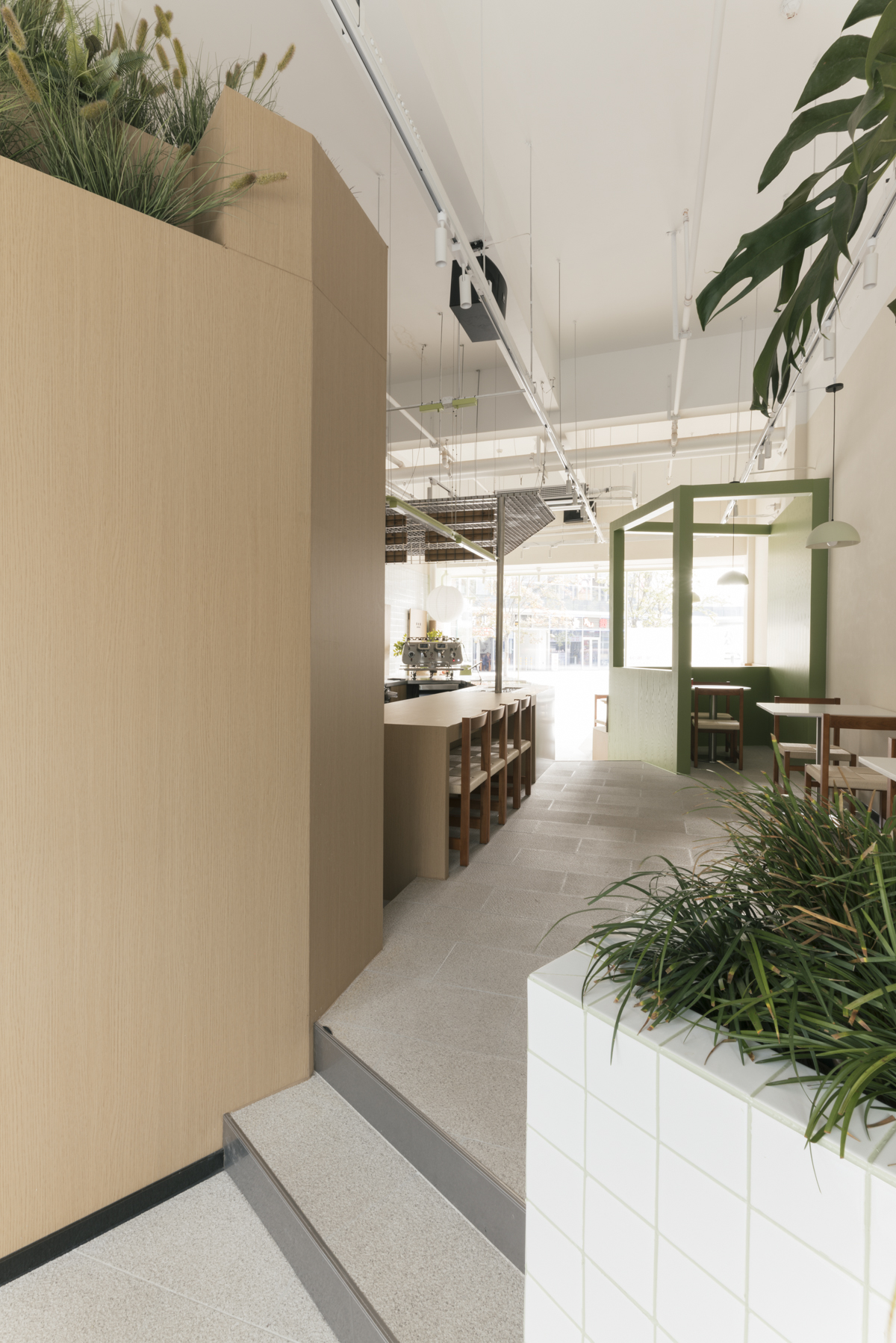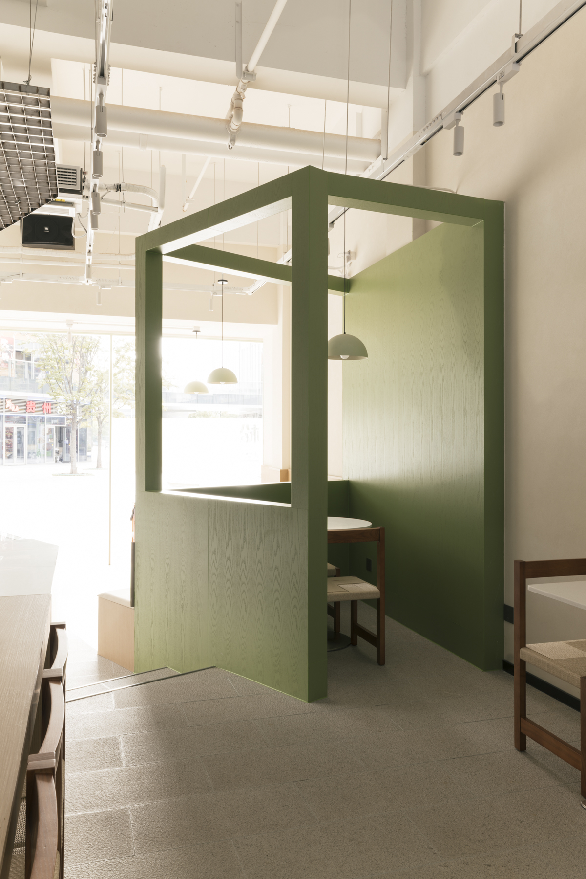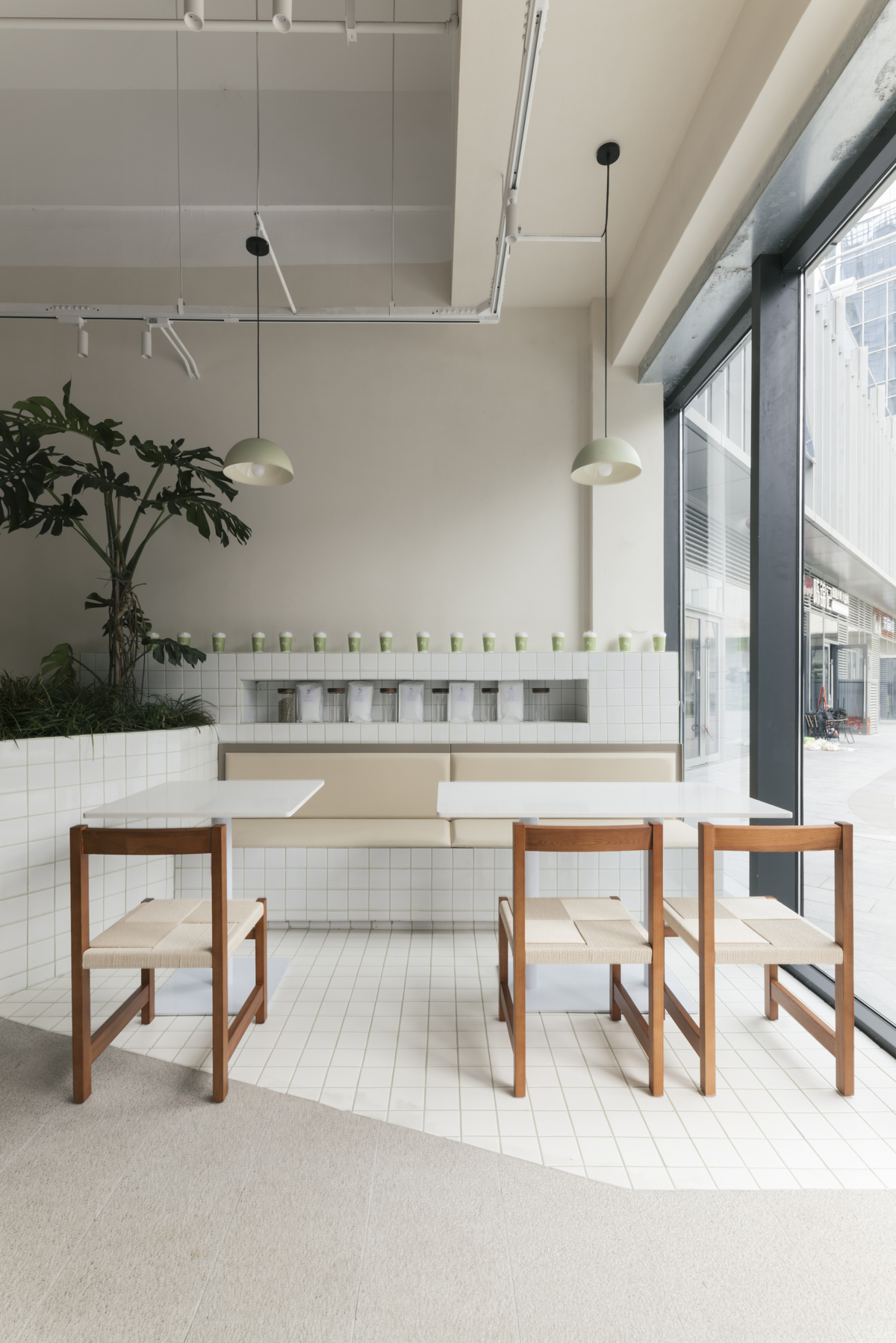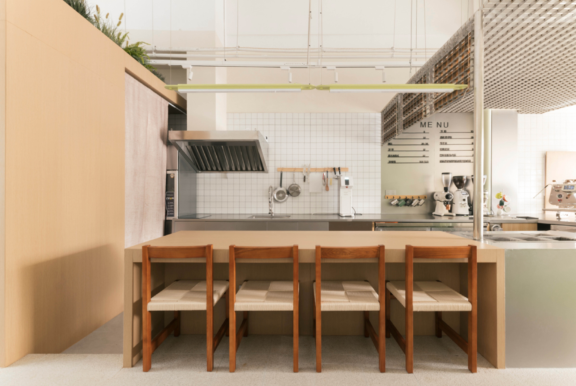 The spatial rhythm is intentionally slowed down. From the turning corner at the entrance to the long table deep inside, the circulation unfolds through pauses and gentle shifts rather than a straight line. This rhythm allows the space to breathe, and every shift of view carries a quiet sense of ease.