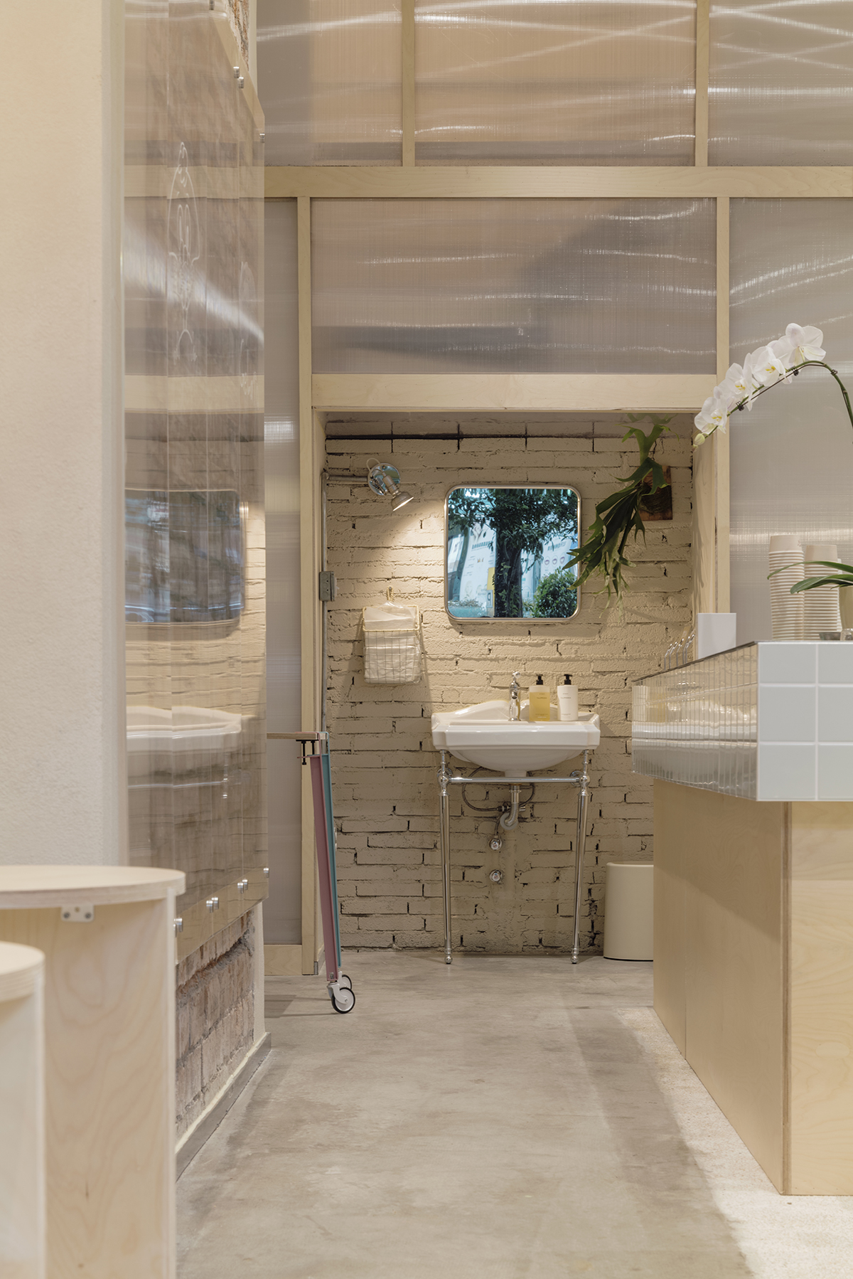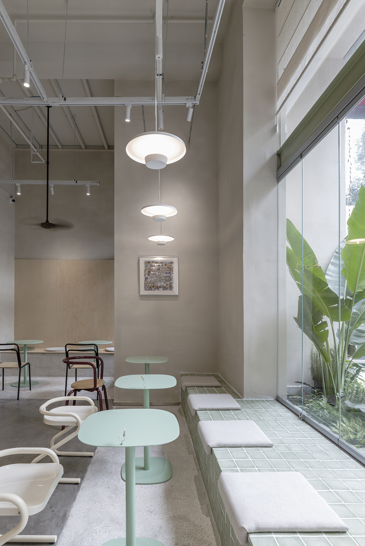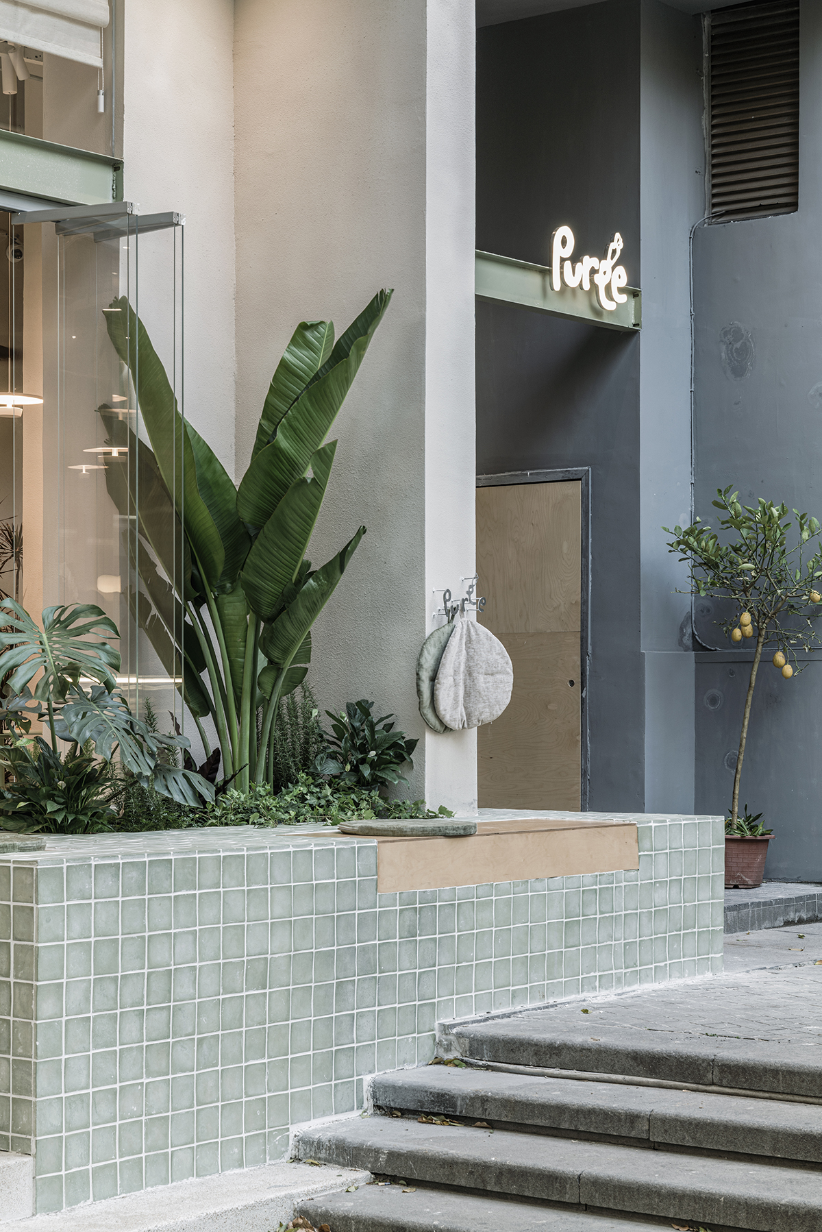 Material choices emphasize familiarity and everyday use: wood, glazed tiles, and greenery, combined with the existing base condition. Informal furniture further softens the space, allowing it to feel closer to daily life than a styled retail interior.