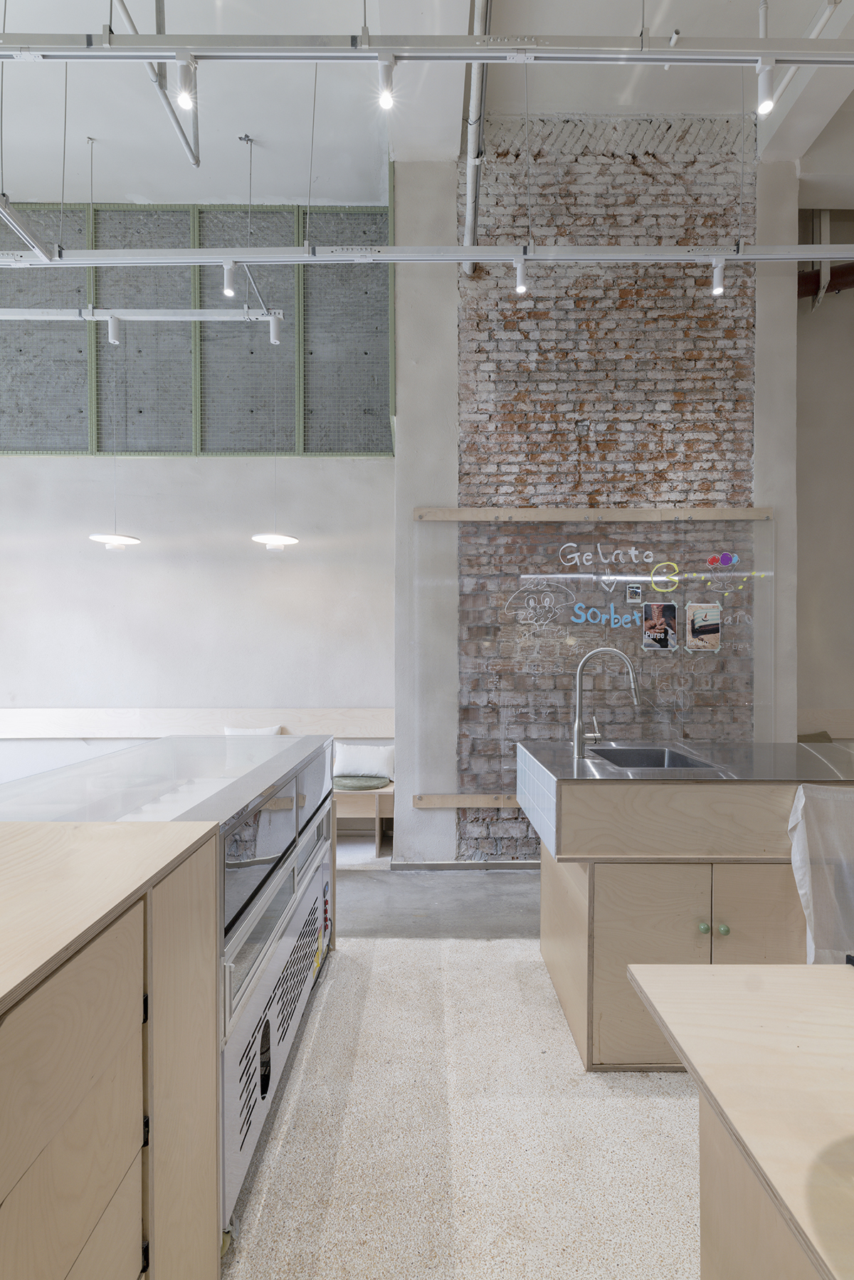 The second strategy addresses the division between operational and functional zones. A semi-transparent partition softly separates the space. On the ground floor, the kitchen, pastry area, and wash basin remain partially visible; the upper floor serves as storage, perceived through the translucent surface. This balance of distance and openness helps narrow the psychological gap between brand and visitor.